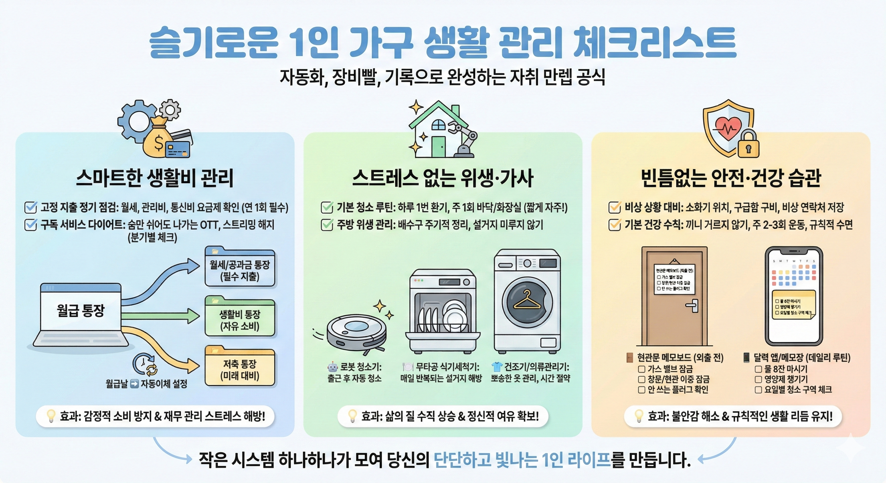 혼자 사는 생활은 스스로를 관리하는 능력을 키우는 과정입니다. 처음부터 완벽할 필요는 없지만, 자동이체 설정으로 재무를 자동화하고, 생활 편의 가전으로 시간을 확보하며, 체크리스트로 안전과 건강을 관리하는 기본만 지켜도 훨씬 안정적인 일상을 만들 수 있습니다. 1인 가구 생활은 자립의 시작이며, 작은 시스템 하나하나가 삶의 질을 결정합니다.