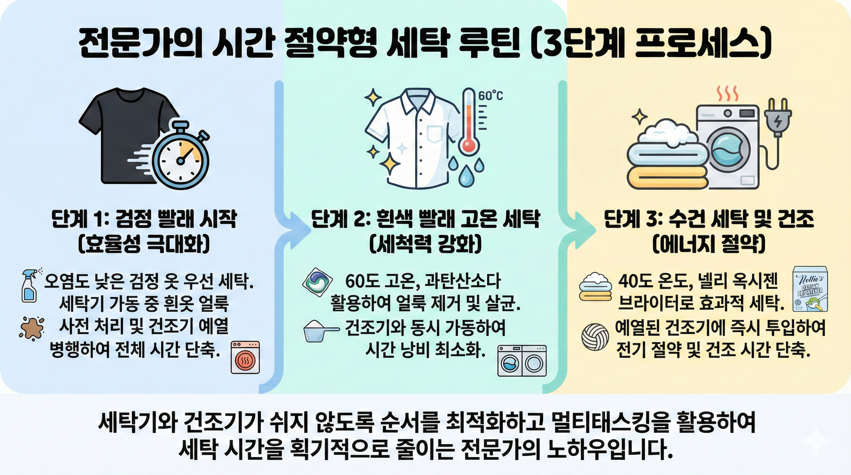 이러한 세탁 루틴은 세탁소에서 중요하게 여기는 생산성 개념을 가정에 적용한 것입니다. 세탁기와 건조기가 쉬는 시간을 최소화하고, 각 단계에서 다음 작업을 미리 준비하는 멀티태스킹을 통해 시간 로스를 줄입니다. 일반 가정에서도 이 방법을 적용하면 빨래에 소요되는 총 시간을 크게 줄일 수 있습니다.