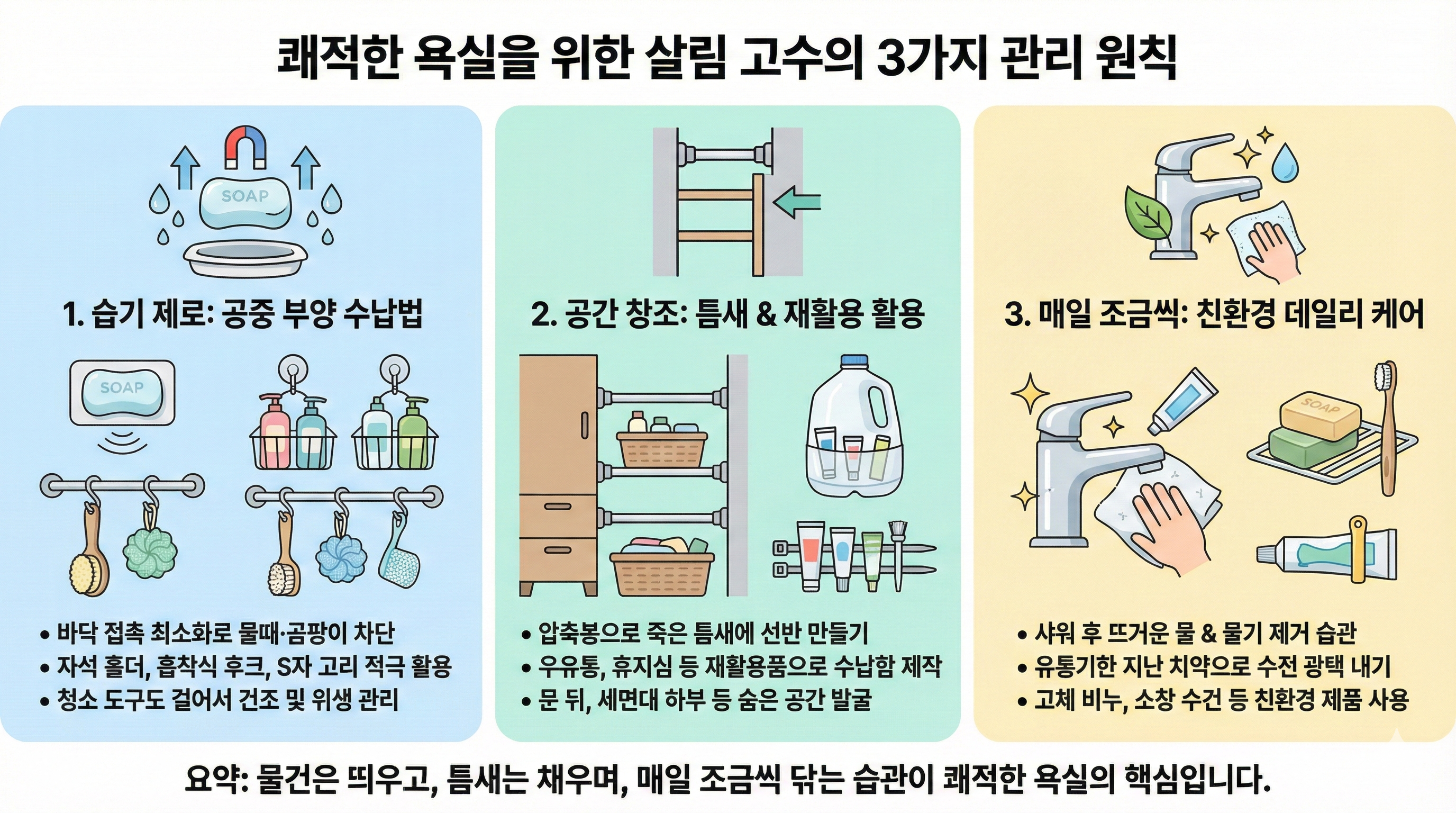 현대인의 주거 공간에서 욕실과 화장실은 가장 관리가 까다로운 영역입니다. 습기와 물때, 곰팡이 문제는 물론 좁은 공간에 많은 물건을 수납해야 하는 어려움이 있습니다. 살림 고수들이 실천하는 공중 부양 원칙, 틈새 공간 활용, 재활용품 활용, 친환경 제품 사용, 그리고 매일 조금씩 청소하는 습관을 통해 욕실을 깔끔하고 쾌적하게 유지하는 방법을 소개합니다.