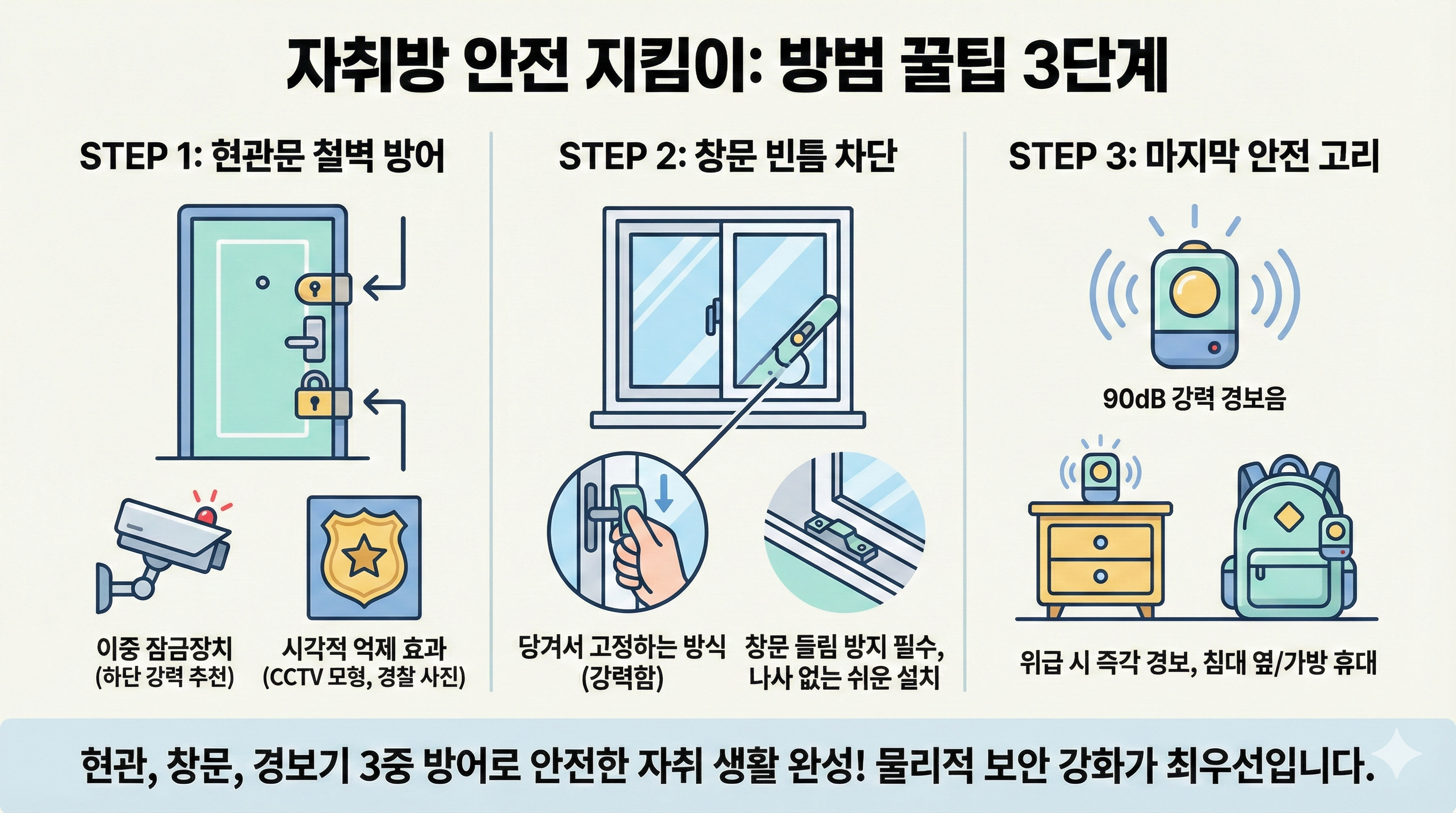 혼자 사는 여성의 방범은 단순한 선택이 아닌 필수 생활 인프라입니다. 현관 잠금장치 강화, 창문 들림 방지 장치, 휴대용 미니 경보기까지 세 가지 방어선을 모두 구축할 때 비로소 실질적인 안전이 확보됩니다. 특히 저렴한 비용으로도 충분한 효과를 낼 수 있다는 점은 자취 생활을 시작하는 분들에게 큰 희소식입니다. 안전은 언제나 가장 먼저 투자해야 할 가치입니다.