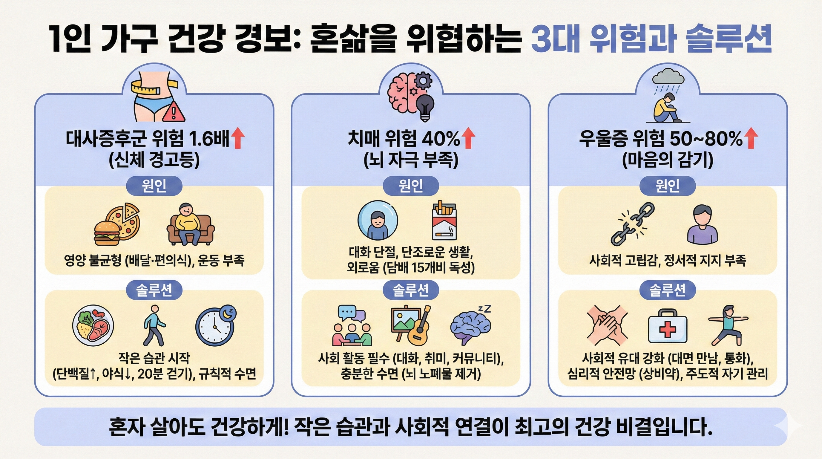 1인 가구의 건강 위험은 대사증후군, 치매, 우울증이라는 세 축으로 수렴됩니다. 이 세 가지는 각각 독립된 문제가 아니라 서로를 악화시키는 연결 고리로 작동합니다. 사용자 비평에서 제안한 것처럼, 수면 리듬을 잡고 규칙적인 식사를 유지하며 꾸준한 운동 습관을 기르는 것이 예방의 기본입니다. 그리고 그 모든 노력을 지속 가능하게 만드는 힘은 결국 타인과의 유대감에서 나옵니다.